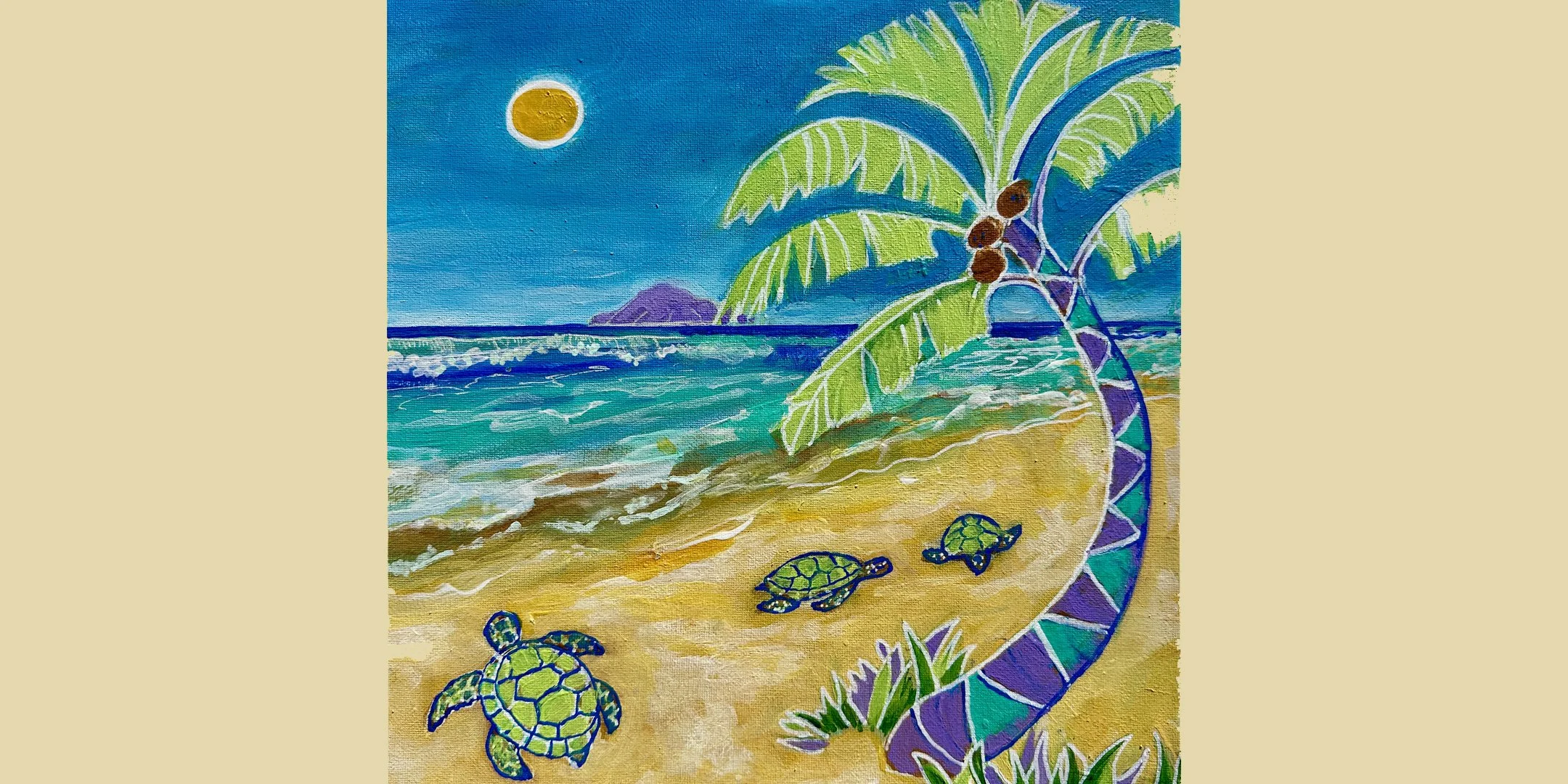 Transport yourself to a sunlit shoreline as you create a vibrant tropical landscape featuring a sweeping palm tree, rolling ocean waves, and charming sea turtles. In this step-by-step acrylic workshop, students will learn how to build a lively beach scene using bold color, simple shapes, and expressive brushwork—perfect for beginners and intermediate painters alike.
