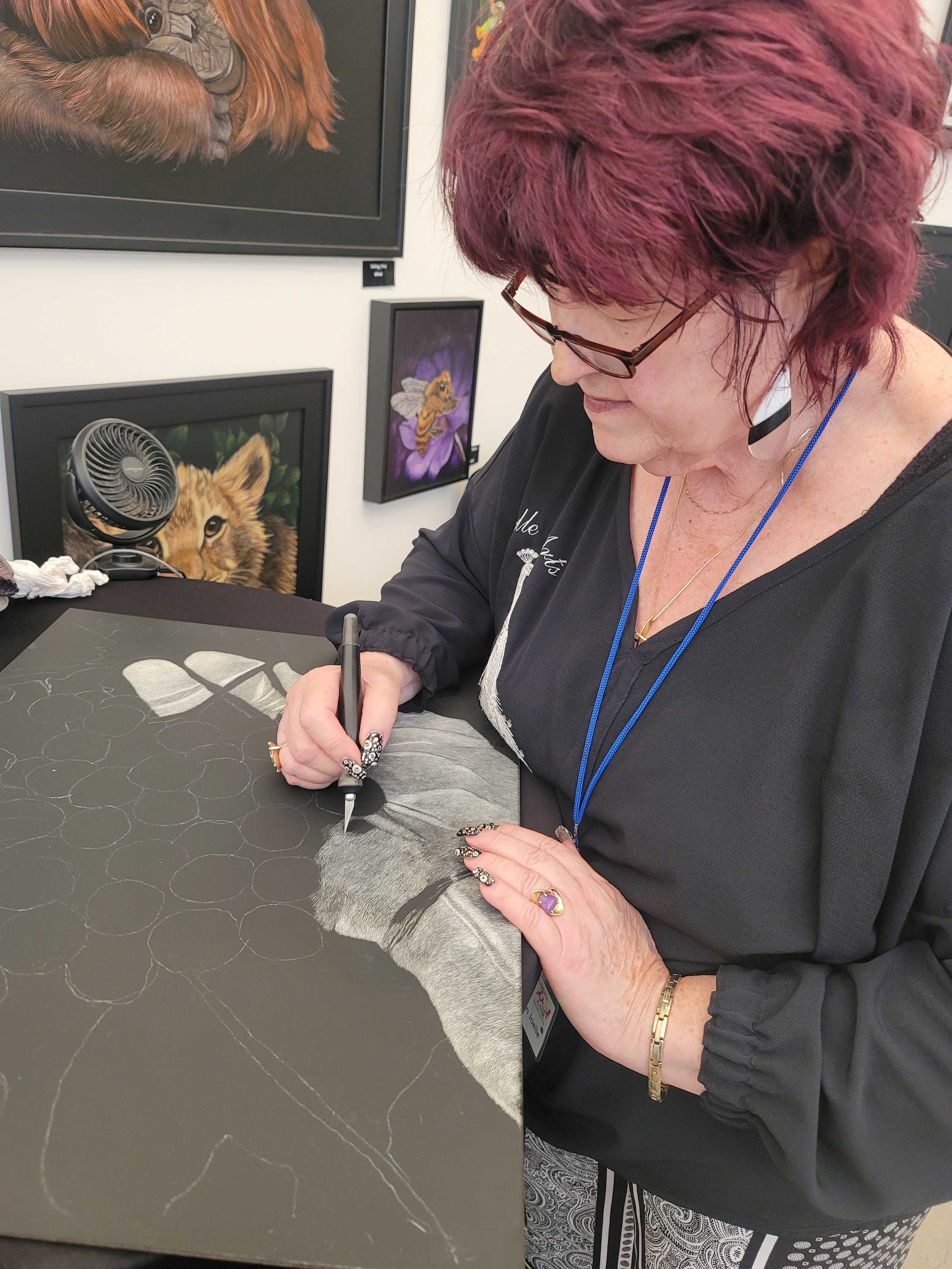 You will end up with a dramatic black and white art piece. There will be a variety of images provided or you can bring a 5x7 image of your choice printed on regular paper. No people portraits at this time. Bring images of flowers or animals or pets to start.